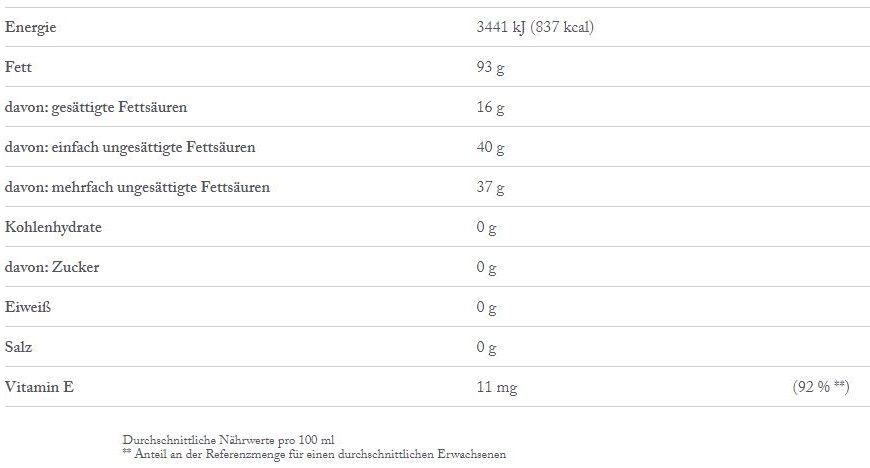 | Usage | Genießen Sie den nussigen, sehr milden Geschmack - nicht nur an Asia-Gerichten, sondern auch an Gemüse, Fisch, Reis und Nudeln. Bitte nur sanft erhitzen und erst kurz vor dem Servieren hinzugeben. |