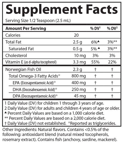 | Description | The Very Finest Fish Oil™ for children in orange flavor has won numerous awards for its taste and quality. To ensure maximum freshness, The Very Finest Fish Oil™ is handled very gently from sea to store. Carlson Labs supply high quality, deep cold water fish using traditional and sustainable methods. The Very Finest Fish Oil™ is then bottled with a touch of vitamin E and flushed with nitrogen to remove oxygen and prevent oxidation. Each teaspoon of The Very Finest Fish Oil™ contains 800 mg of Omega-3 fatty acids, including EPA and DHA, which support heart, brain, vision and joint health. As with all Carlson Omega-3s, freshness, potency and purity are guaranteed. |