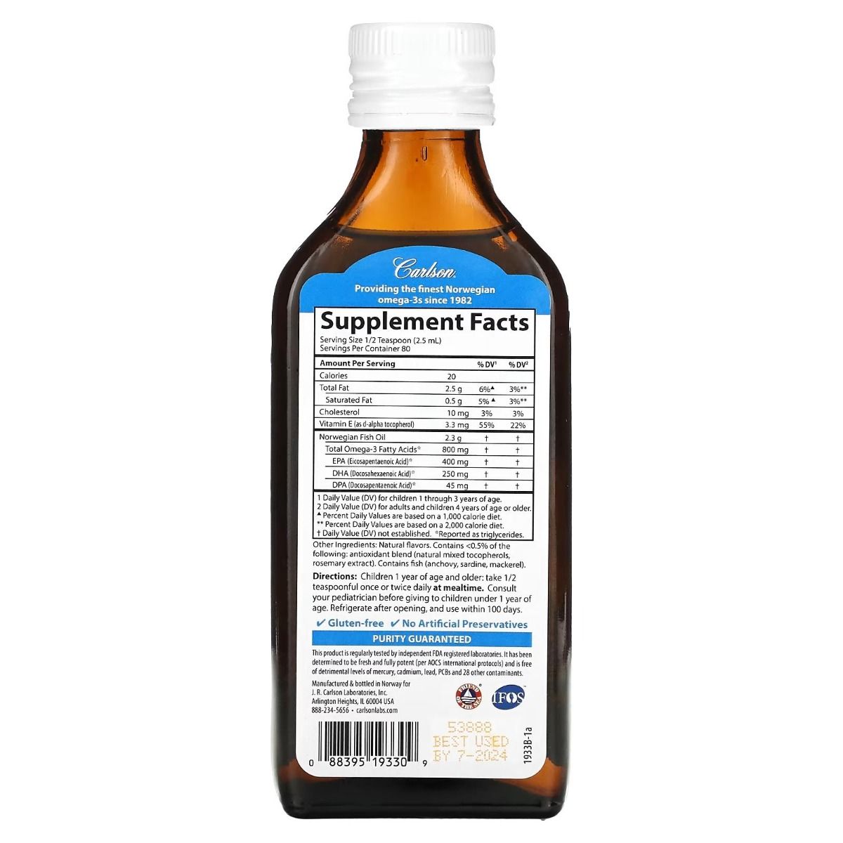 | Description | The Very Finest Fish Oil™ for Kids with Berry Blend has won numerous awards for its taste and quality. To ensure maximum freshness, The Very Finest Fish Oil™ is handled very gently from sea to store. Carlson Labs supply high quality, deep cold water fish using traditional and sustainable methods. The Very Finest Fish Oil™ is then bottled with a touch of vitamin E and flushed with nitrogen to remove oxygen and prevent oxidation. Each teaspoon of The Very Finest Fish Oil™ contains 800 mg of Omega-3 fatty acids, including EPA and DHA, which support heart, brain, vision and joint health. As with all Carlson Omega-3s, freshness, potency and purity are guaranteed. |