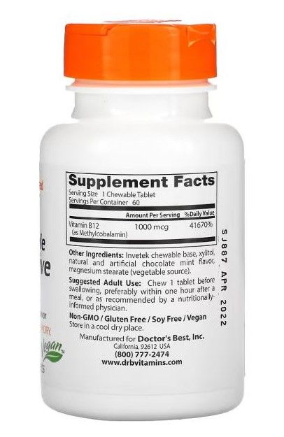 Doctor's Best Chewable Fully Active B12 provides vitamin B12 in its most bioactive form as methylcobalamin for optimal absorption. Vitamin B12 is a key factor in DNA synthesis, fatty acid and amino acid metabolism in the body. It is important for the production of red blood cells in the bone marrow and nerve sheath. Vitamin B12 is important for neurological health, mood and energy. Chocolate Mint Flavor
