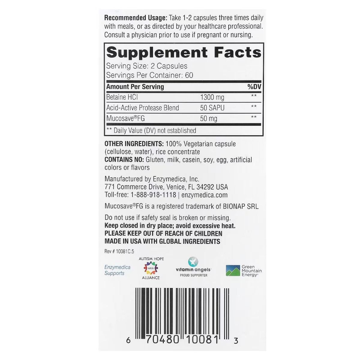 Enzymedica, Betaine HCl, 120 Capsules