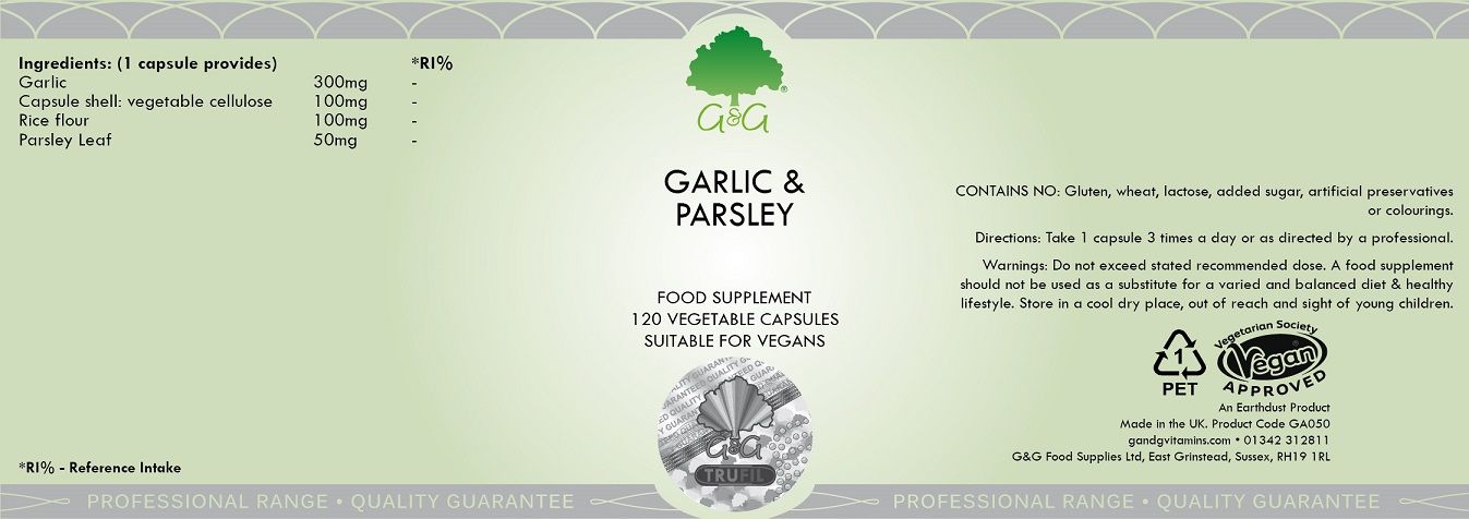 Garlic and parsley are two herbs that have diverse properties making it a blend useful in many areas.G&G Vitamins' Garlic and Parsley comes in a vegetarian cellulose capsule. This enables them to offer a supplement that is free from excipients, binders and coatings that are commonly found in tablet supplements. The vegetarian cellulose capsules are designed specifically to break down naturally within the acid of your stomach, ensuring that your body absorbs the nutrients naturally during digestion. |