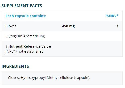 † Nutrient Reference Value (NRV*) not established Other Ingredients: Cloves, Hydroxypropyl Methylcellulose (capsule). |
