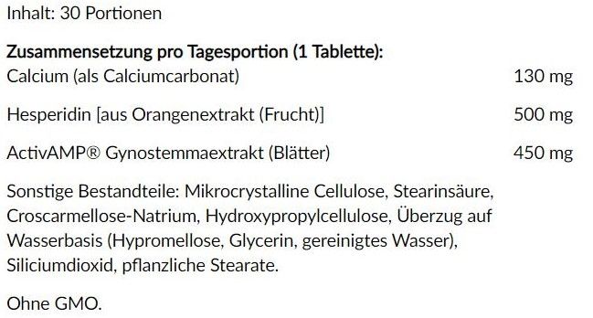 | Content | Mikrocrystalline Cellulose, Stearinsäure, Croscarmellose-Natrium, Hydroxypropylcellulose, Überzug auf Wasserbasis (Hypromellose, Glycerin, gereinigtes Wasser), Siliciumdioxid, pflanzliche Stearate. Ohne GMO. |