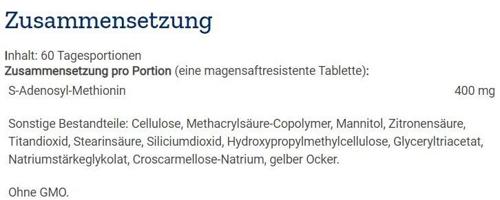 | Content | Cellulose, Methacrylsäure-Copolymer, Mannitol, Zitronensäure, Titandioxid, Stearinsäure, Siliciumdioxid, Hydroxypropylmethylcellulose, Glyceryltriacetat, Natriumstärkeglykolat, Croscarmellose-Natrium, gelber Ocker. |