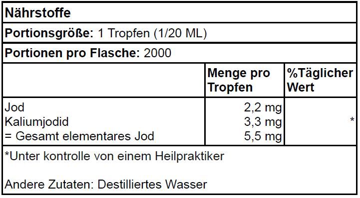 | Usage | This product must be diluted before use. Dilute 1 drop of this product in 60 drops (3 ml) of water and take 2 drops of this dilution containing 500 mcg iodine (333% NRV) once daily. This product is suitable for vegans and vegetarians. Discontinue use if any side effect occurs. Do not exceed the recommended daily dose. Not for daily continuous use. Do not use if you are allergic to iodine. |