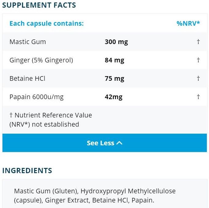 | Contents | Mastic Gum, Hydroxypropyl Methylcellulose (Capsule), Ginger Extract, Betaine HCl, Papain. |
