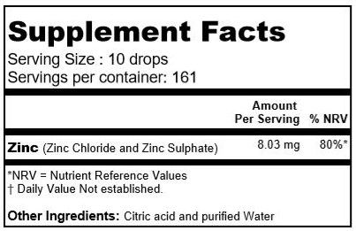 † Nutrient Reference Value (NRV*) not established Other Ingredients: Purified Water, Zinc Chloride, Zinc Sulphate, Citric acid. |
