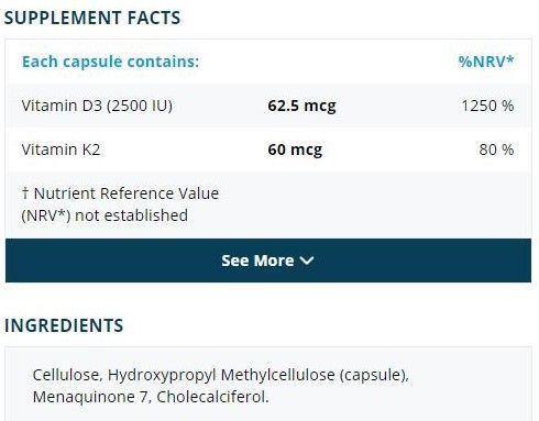 | description | Vitamin D3 contributes to the maintenance of normal bones, teeth, muscle function and the normal functioning of the immune system. Vitamin D also contributes to the normal absorption/utilization of calcium and phosphorus. Vitamin K contributes to normal blood clotting and the maintenance of normal bones. Vitamin K ensures that calcium gets into the bones and not, for example, into the arteries where it can damage them. |
