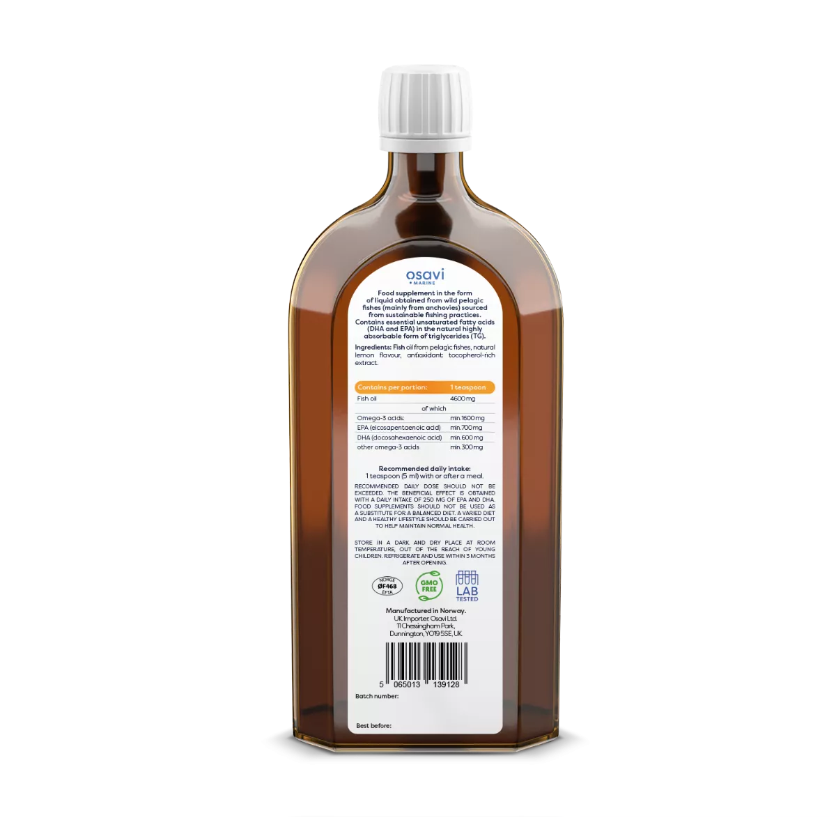 Fish oil from pelagic fishes, natural lemon flavour, antioxidant: tocopherol-rich extract.