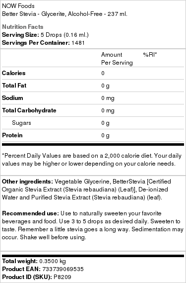 | Description | Stevia Glycerite is non-alcoholic and a calorie-free, low-glycemic, natural herbal sweetener that is a perfect substitute for table sugar and artificial sweeteners. Unlike chemical sweeteners, NOW Stevia Glycerite contains natural herbal stevia extracts. |