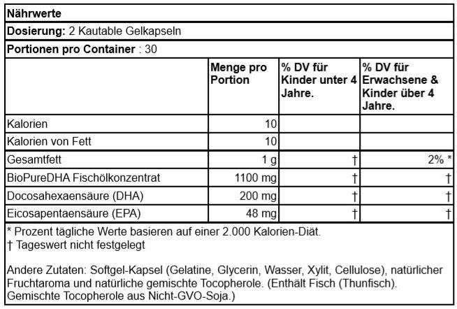 | Content | Softgel-Kapsel (Gelatine, Glycerin, Wasser, Xylit, Cellulose), natürlicher Fruchtaroma und natürliche gemischte Tocopherole. (Enthält Fisch (Thunfisch). Gemischte Tocopherole aus Nicht-GVO-Soja.) |