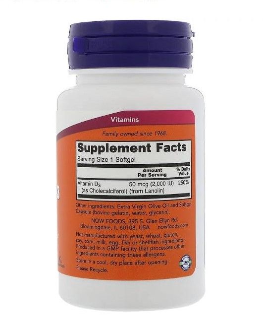 | Description | Now Foods Vitamin D-3 2,000 IU Softgel Capsules in an easily absorbed liquid softgel form ● Supports the absorption of calcium and phosphorus ● Contributes to normal blood calcium levels ● Vitamin D supports muscle function maintenance ● Contributes to the maintenance of normal bones and teeth ● Supports the normal function of the immune system ● Participates in cell division. |
