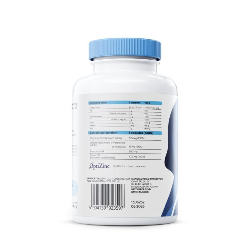 | Contents | Magnesium salts of citric acid, shell (hydroxypropyl methyl cellulose), inulin, L-aspartic acid, OptiZinc® (zinc mono-L-methionine sulfate, natural vanilla flavouring), pyridoxine hydrochloride. |