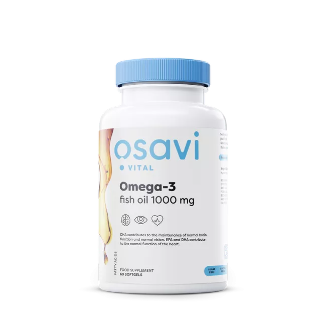 The Osavi product is a specially formulated omega-3 fatty acid concentrate derived from the oil of pelagic fish (anchovies) from sustainable fisheries in the Pacific Ocean. The supplement is produced and tested according to the GOED (World EPA and DHA Omega-3 Organisation) monograph, and the oil used in its production is certified Friend of the Sea. There are 1,000 mg of purified fish oil per capsule and 2,000 mg of oil in the recommended daily serving (2 capsules), including min. 700 mg of omega-3 fatty acids.The product has a high content of EPA (min. 360 mg) and DHA (min. 240 mg). Omega-3 fish oil 1000 mg is a supplement in soft capsule form providing the essential fatty acids EPA and DHA.