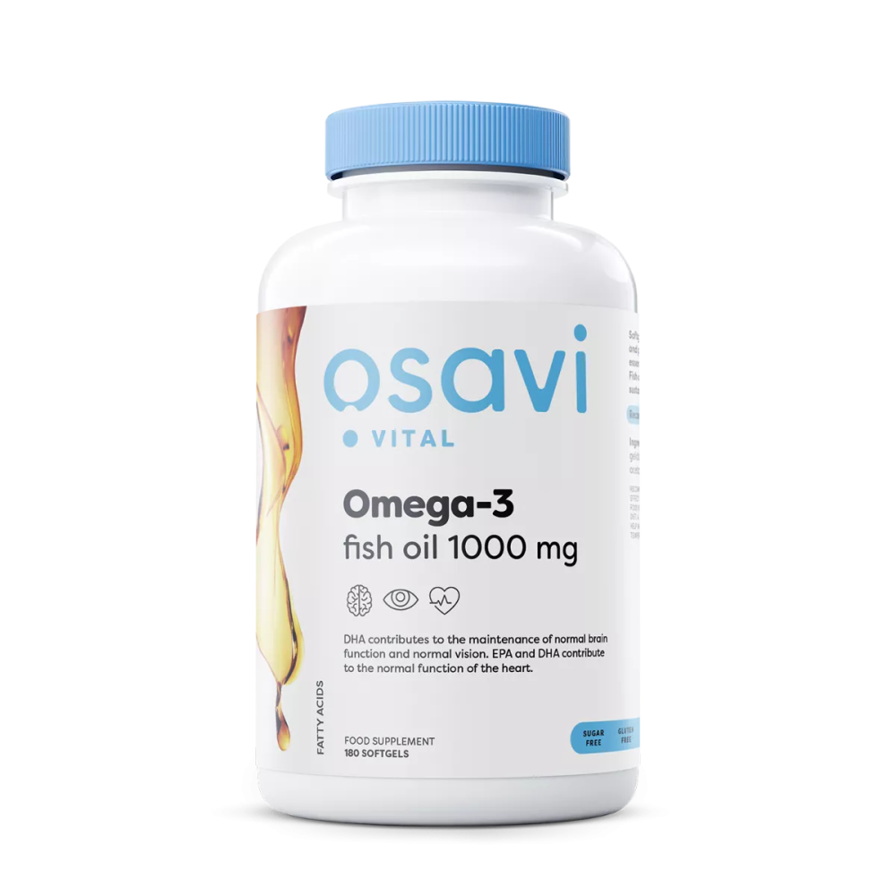 The Osavi product is a specially formulated omega-3 fatty acid concentrate derived from the oil of pelagic fish (anchovies) from sustainable fisheries in the Pacific Ocean. The supplement is produced and tested according to the GOED (World EPA and DHA Omega-3 Organisation) monograph, and the oil used in its production is certified Friend of the Sea. There are 1,000 mg of purified fish oil per capsule and 2,000 mg of oil in the recommended daily serving (2 capsules), including min. 700 mg of omega-3 fatty acids.The product has a high content of EPA (min. 360 mg) and DHA (min. 240 mg). Omega-3 fish oil 1000 mg is a supplement in soft capsule form providing the essential fatty acids EPA and DHA.
