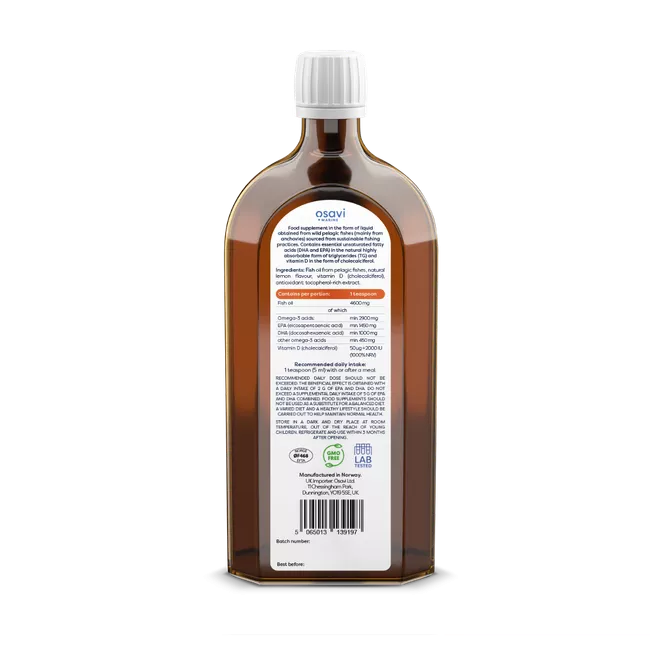 We offer you the food supplement Super Omega + D3, 2900 mg Omega-3 containing oil extracted from pelagic fish (mainly anchovies) sustainably fished in Norway. The product has a natural lemon flavour and contains a high concentration of essential fatty acids (DHA and EPA) in the highly digestible triglyceride (TG) form and vitamin D in the form of cholecalciferol. One teaspoon a day (5 ml) provides as much as 2900 mg of omega-3 fatty acids (including: 1450 mg EPA and 1000 mg DHA) to maintain normal blood triglyceride levels and 50 μg = 2000 IU (1000%) of vitamin D. Take care of your cardiovascular system and additional immunity with Super Omega + D3, 2900 mg Omega 3.
