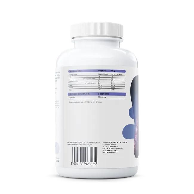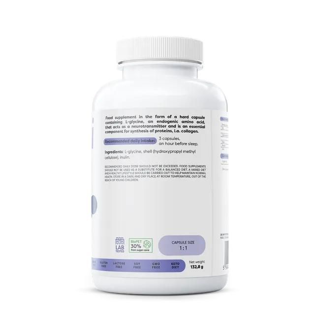 The promising properties of glycine are attracting more and more people's interest in its effects. It turns out that despite being produced in the body, some individuals may suffer from its deficiency. A proper diet and supplementation usually help restore the body's balance. Discover the benefits of using Glycine 1000 mg. Glycine, Gly (Latin: acidum aminoaceticum), is the smallest and simplest organic compound among all amino acids. It is used for protein production. It is endogenous, meaning the body has the ability to produce it on its own. Glycine plays important roles in the body, including the nervous system and the motor system. Studies have shown that glycine, as a neurotransmitter, is involved in processing motor and sensory information, enabling movement, vision, and hearing [1]. This amino acid also participates in collagen synthesis, potentially supporting cartilage regeneration. It has been proven that a severe glycine deficiency negatively affects collagen production. It is worth noting that substantial amounts of glycine need to be consumed in the diet to meet the demand for collagen synthesis [2]. According to research, taking glycine in the evening may improve subjective sleep quality and effectiveness, reducing daytime sleepiness and positively influencing cognitive functions [3]. Improvement in well-being upon awakening has also been observed, with study participants reporting reduced fatigue, increased vitality and energy, and improved mental clarity [4]. Glycine can be relatively easily obtained through a protein-rich diet. Good sources of this amino acid include meat, fish, dairy products, and vegetables [5]. Supplements are also helpful in meeting glycine requirements, allowing for personalized dosage. Our supplement stands out due to its high glycine content (1000 mg in one capsule). The recommended daily dosage is 3000 mg, which can be achieved by taking 3 capsules. We suggest using the product 1 hour before bedtime. The product can also be taken in liquid form—simply open the capsule, mix it with water, and consume immediately. There is no need to worry about unpleasant taste sensations as glycine is sweet, so using it in powder form poses no problems. |