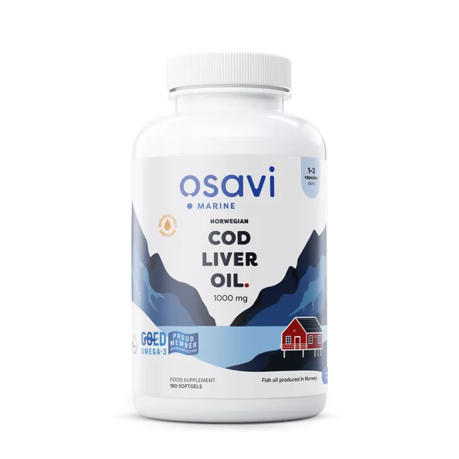 Cod Liver Oil 1000 mg is a food supplement in soft capsule form containing oil extracted from sustainably fished wild Atlantic cod (Gadus morhua). It is produced in Norway using molecular distillation and manufactured in accordance with the GOED (World EPA and DHA Omega-3 Organisation) monograph. It contains a high concentration of essential fatty acids (DHA and EPA) in a highly bioavailable triglyceride (TG) form. In one capsule you will find as much as 1,000 mg of cod liver oil (including: 70 mg EPA and 100 mg DHA) as well as 270 µg vitamin A (34% RWS) and 400 IU vitamin D (200% RWS). The supplement is enriched with a natural lemon flavour to neutralise the fishy aftertaste. It is available in three versions: 180, 90 or 60 capsules, so you can choose a pack for your preferred supplementation time. We recommend taking 1-2 capsules daily with a meal.