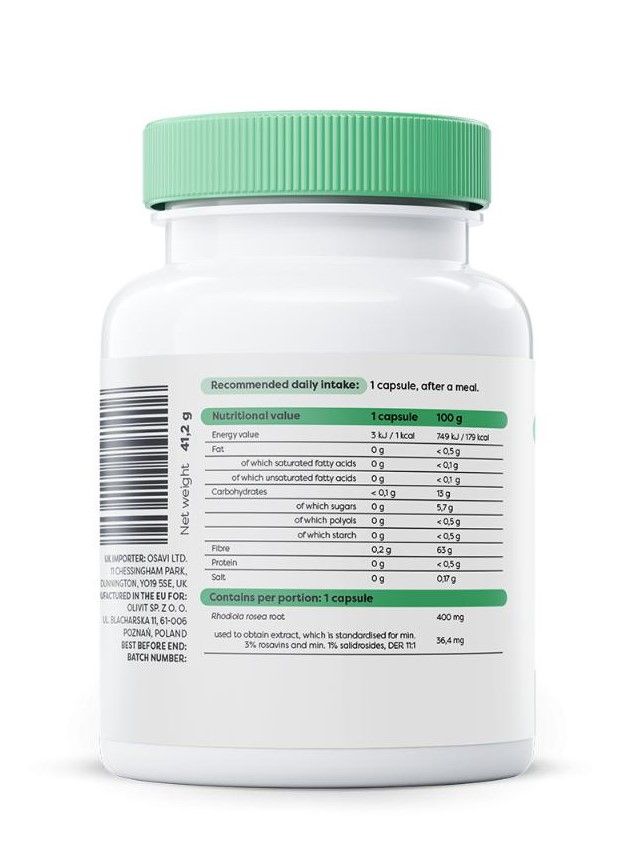 - Contains standardised extract of Rhodiola rosea root containing min. 3% rosavins and min. 1% salidrosides.