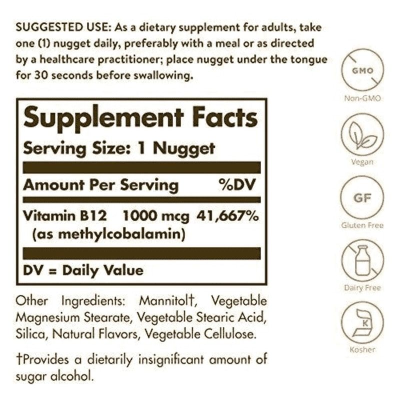 Solgar recommends taking one (1) nugget daily, preferably with a meal. Place the nugget under the tongue for 30 seconds before swallowing. Or as directed by your healthcare practitioner.