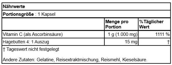 | Description | Eine hochwirksame Vitamin C-Quelle mit Hagebutten! Hagebutten haben Bioflavonoide, die die Absorption des Vitamins fördern und die antioxidative Wirkung erhöht. Jede Kapsel enthält 1.000 mg Vitamin C mit 15 mg Hagebuttenextrakt. |
