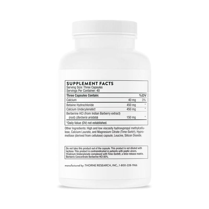 Many doctors consider gut ecology - maintaining a healthy balance of the microorganisms that normally live in the digestive tract - and gut function to be key to overall health, including proper immune function.* In women's health in particular, the relationship between gut flora health and vaginal flora is receiving increasing attention. Thorne's Undecyn combines the flora-boosting properties of a unique form of undecylenic acid - which is more potent than caprylic acid - with betaine hydrochloride. This formulation allows Undecyn to maintain full effectiveness throughout the gastrointestinal tract. Berberine, which also helps maintain a healthy balance of normal bacteria in the gut, is also included in Undecyn.*