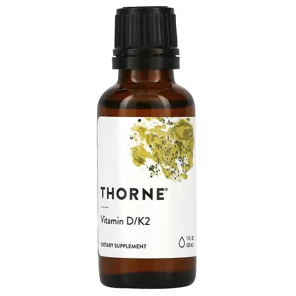 Both vitamin D and vitamin K2 support bone and muscle health, along with cardiovascular health and immune function. It is important to maintain an optimal level of vitamin D in the body through all stages of life, from fetal development to old age. Vitamin K2, a series of molecules known as menaquinones, exerts a more powerful influence on bone than does vitamin K1. The vitamin K2 in this formula is the well-studied MK-4. Combining vitamins D and K can provide greater support of the immune and cardiovascular systems than each offers separately. For example, vitamin D is necessary for calcium absorption, and vitamin K is important for directing calcium to the bones and away from the soft tissues, such as blood vessels and kidneys. Thorne's Vitamin D/ K2 Liquid also provides nutritional support for oncology patients.