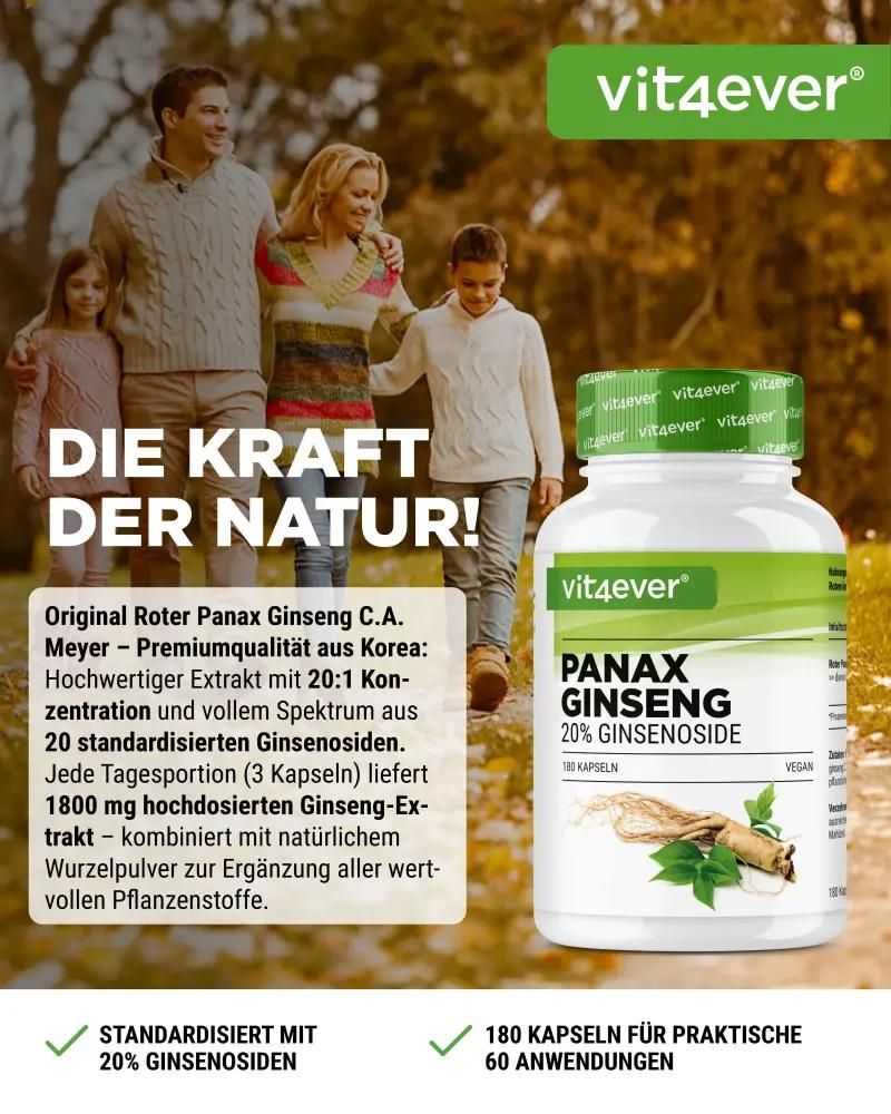 For centuries, red Korean ginseng (Panax ginseng CA Meyer) has been considered one of the most valuable natural remedies in traditional Asian health practices. Our  Panax ginseng extract  combines this tradition with modern quality standards: With a  high-dose 20:1 extract  and a standardized content of  360 mg of ginsenosides per daily serving,  this product offers the highest purity and effectiveness – completely free of unnecessary additives.