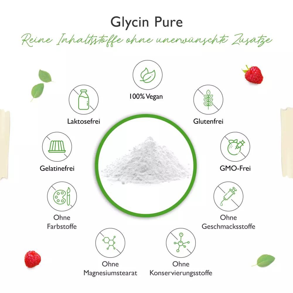 Unser Glycinpulver zu 100% vegan & frei von Magnesiumstearat, Aromen, Farbstoffen, Stabilisatoren, Gelatine und selbstverständlich auch GMO-frei, laktosefrei, glutenfrei & ohne Konservierungsstoffe.