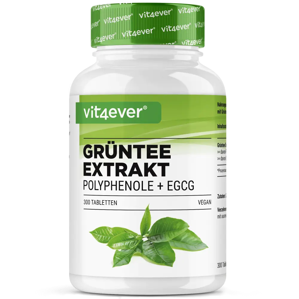 Green Tea Extract – Naturally concentrated with EGCG & CaffeineTradition meets modern plant powerGreen tea has been valued for thousands of years – originally in Asia, but now worldwide. Its richness in valuable plant compounds, including the well-known polyphenols and catechins, makes it a popular ingredient in modern dietary supplements. The high-dose green tea extract in our tablets is a concentrated form of this traditional leaf. What's inside?Each daily dose (4 tablets) provides you with 2000 mg of green tea extract – including 1000 mg of polyphenols, 300 mg of epigallocatechins (EGCG), and 160 mg of natural caffeine. A powerful combination in a convenient tablet form – easy to dose, clean, and ideal for everyday use. Highlights at a glance