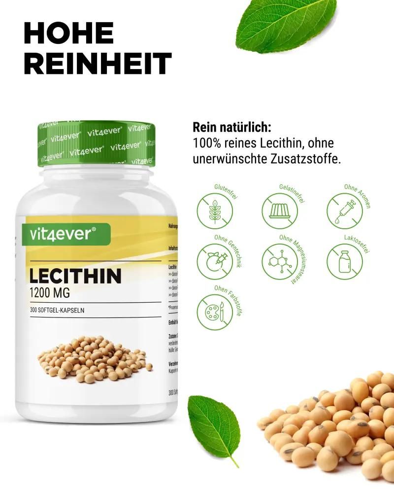 Natural lecithin occurrenceLecithin in significant quantities is found especially in animal foods such as egg yolks, offal, brain and liver. But it is also found in plant foods such as soybeans, sunflower seeds, flax seeds, walnuts, corn germ, peas, hemp seeds and vegetable oils. Special feature – Vit4ever Lecithin capsulesVit4ever Lecithin capsules are not only very highly dosed with 1200 mg per capsule, but are also available in the form of an oil-based softgel capsule, which can significantly increase bioavailability. Our lecithin capsules are particularly characterized by their high and differentiated content of phosphatides (phosphatidylcholine, phosphatidylethanolamine, phosphatidylinositol, phosphatidic acid)! Phosphatides consist of glycerin and two fatty acids, the third fatty acid is replaced by a phosphoric acid residue. Each of these phosphatides has different tasks and supports different functions in our body, such as the construction of biomembranes or the transmission of extracellular signals in the cell. |