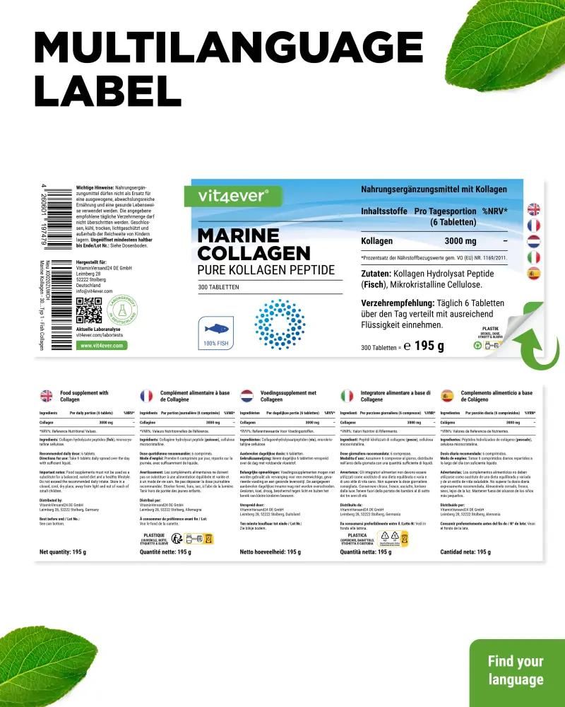 What makes Marine Collagen special?High-quality collagen peptides:The type I collagen used comes from fish and is characterized by its high purity and bioavailability. It is obtained through a gentle hydrolysis process that preserves its natural properties. Long-lasting care:With 300 tablets per container and a daily dose of 6 tablets, you are well supplied for 50 days. Perfect for regular use. Pure & natural:Vit4ever Marine Collagen is free from unnecessary additives such as colorants and preservatives as well as lactose and gluten – ideal for a conscious diet. Highlights at a glance