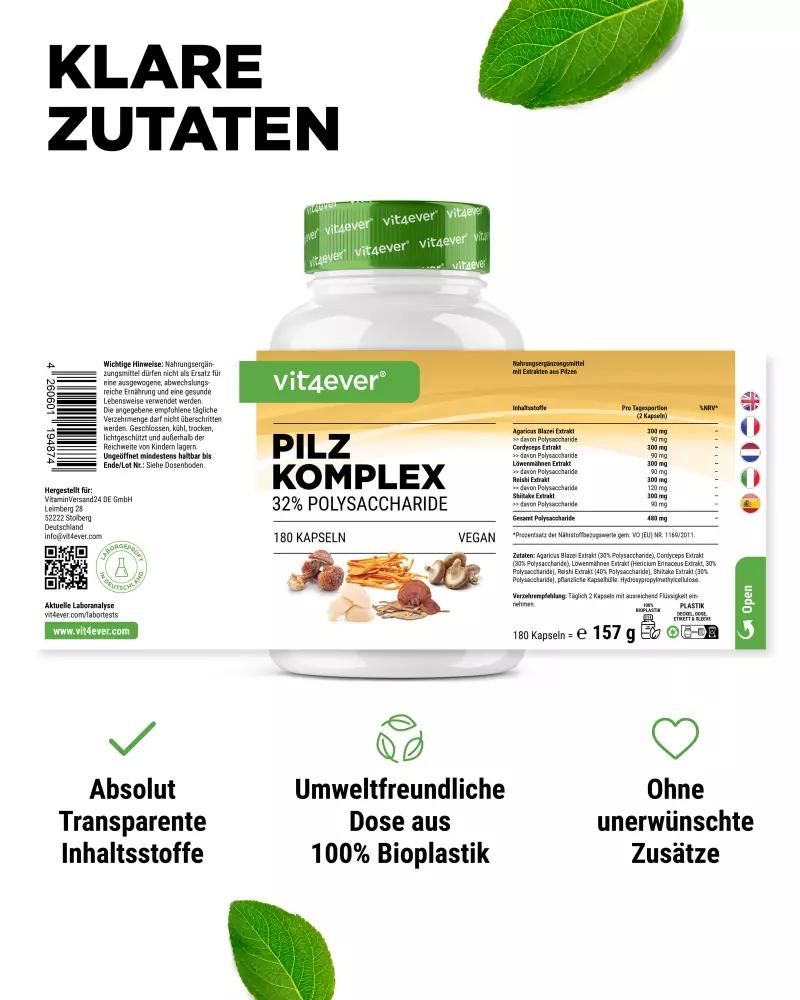 | Description | Discover the traditional power of nature with the 5 vital mushroom complex from Vit4everImmerse yourself in the world of traditional natural power with the unique 5 vital mushroom complex from Vit4ever. Our carefully composed formula combines selected fruit body extracts from Agaricus Blazei, Cordyceps, Hericium, Reishi and Shiitake. These are enriched with 32% bioactive polysaccharides to support your well-being. A source of traditional wisdom and modern researchMedicinal mushrooms have been valued for their health-promoting properties in many cultures for centuries. There are numerous studies that examine the diverse health benefits of these mushrooms. Our 5 medicinal mushroom complex is inspired by this long tradition and the findings of modern research. Carefully selected ingredients: