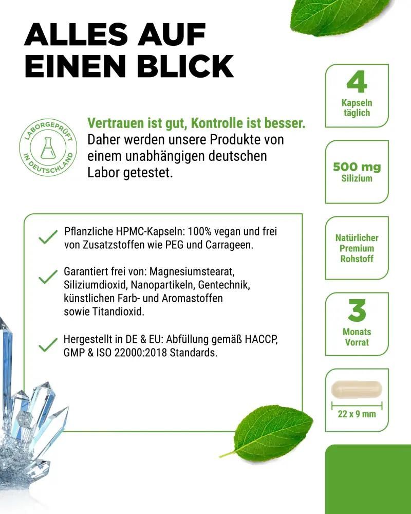 Consumption & application tipTake 2 capsules twice daily with plenty of liquid – ideally in the morning and evening with meals. Can be used year-round or as a course of treatment. ✓ 500 mg silicon | ✓ Vegan | ✓ 100% bamboo extract |