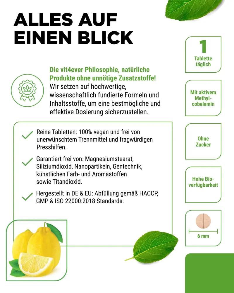 Our  Vitamin B12 500 mcg  is manufactured according to  European quality standards  (DIN EN ISO 9001 and HACCP concept) and, as with all Vit4ever food supplements, we always attach great importance to   using only natural, premium raw materials in production.