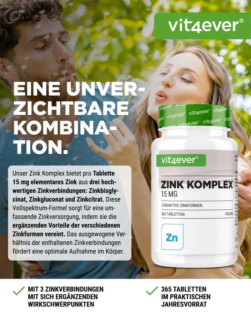 Vit4ever Zinc Complex – Your daily support for health and beautyWhy Zinc is EssentialZinc is an essential nutrient that the body cannot produce itself. It contributes to the maintenance of normal skin, hair and nails, supports the immune system and plays a role in cell division. The 15 mg variant of the Vit4ever Zinc Complex offers a moderate dosage that is ideal for daily needs. The 15 mg variantOur 15 mg variant provides 15 mg of elemental zinc per tablet from three bioactive zinc compounds: zinc bisglycinate, zinc gluconate and zinc citrate. This balanced zinc intake is perfect for anyone who wants to cover their daily needs without overdosing. Important benefits of zinc: