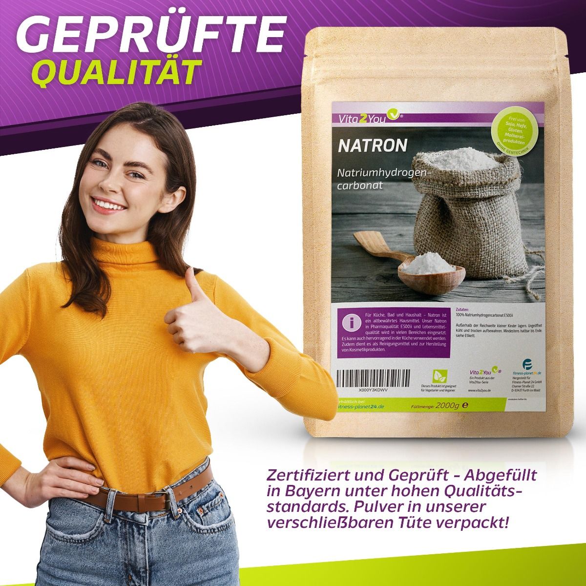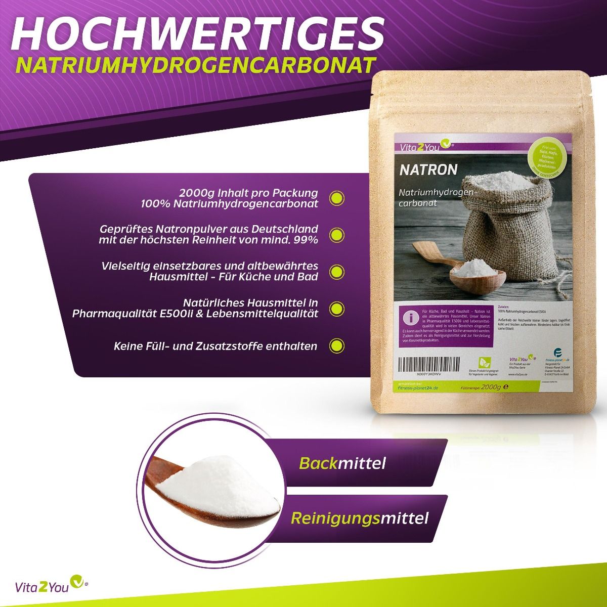 Vita2You Natron Pulver 2kg - Natriumhydrogencarbonat - natriumbicarbonat - Premium Qualität