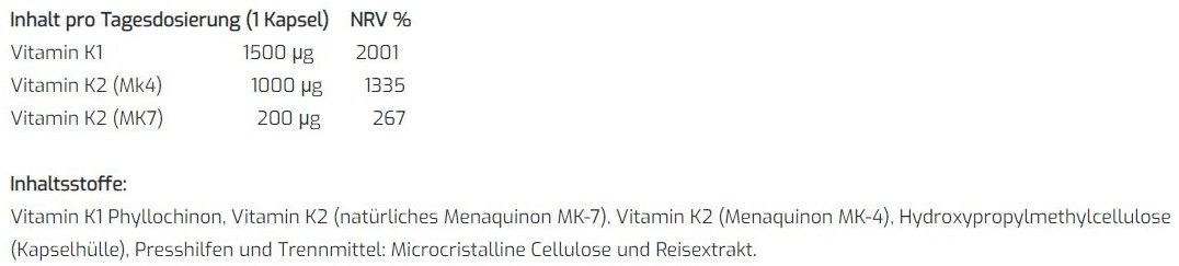 | Contents | Microcrystalline cellulose (filler), hydroxypropylmethylcellulose (glazing agent), vitamin K1 phylloquinone, vitamin K2 (menaquinone MK-4) and vitamin K2 (menaquinone MK-7 / K2VITAL) |