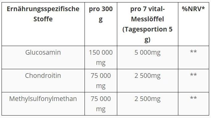 | Usage | 1 x täglich 10 g Pulver (entspricht 5 g Glucosamin, 2,5g Chondroitin, 2,5 g MSM) oder 1 x täglich 10 vital-Messlöffel (beiliegend) mit Wasser, oder Saft vermischt trinken. |