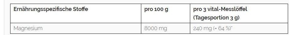 | Guarantee | 100% ohne Zusatzstoffe. Dieses Erzeugnis enthält keine Magnesiumstearat, Anti-Reibungsmitteln, Bindemitteln, Füllstoffe, Hefe, Gluten, Stärke, Lactose, künstliche Süßstoffe, Aromen, Zusatz von Salz, Zusatz von Zucker, Farben oder Konservierungsmitteln. |