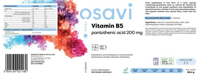 Osavi Vitamin B5 Pantothenic Acid - 200mg - 180 vegan caps